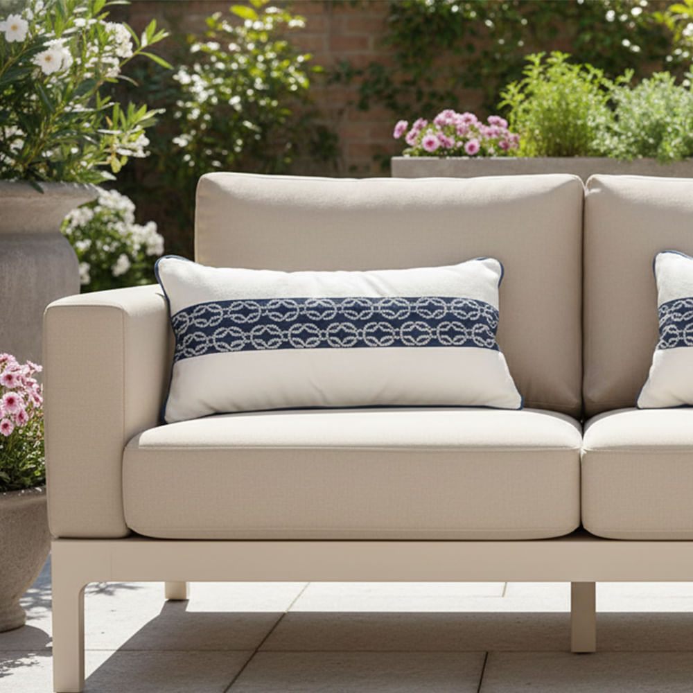 Cojín decorativo con diseño de cadenas en blanco, perfecto para dar un toque de elegancia y confort a tu terraza o jardín.