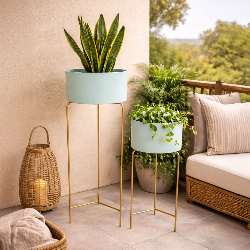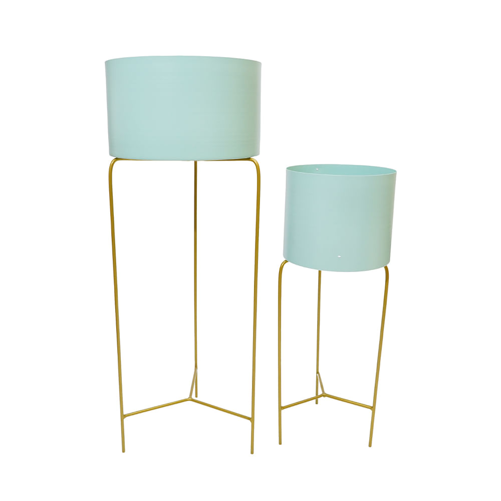 Macetero de metal elevado en verde menta, diseño contemporáneo y color fresco.