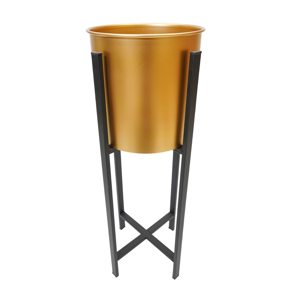 Macetero de metal elevado en dorado y negro, contraste moderno y elegante.