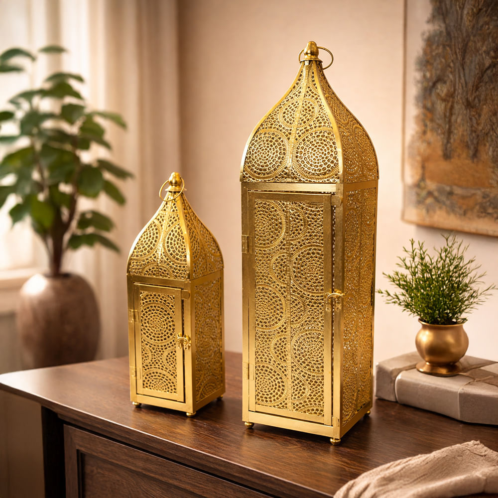 Porta vela de metal con diseño árabe de círculos en dorado, patrones geométricos y lujo.