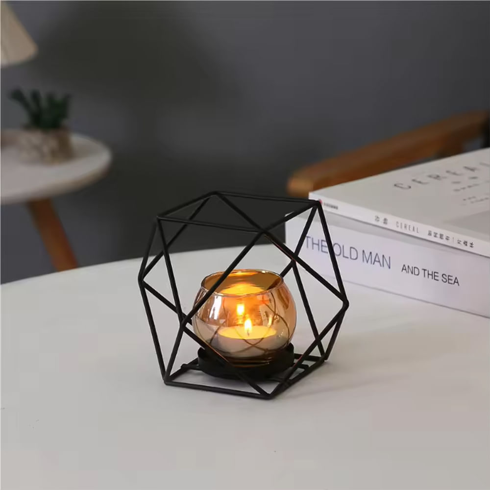 Porta vela de metal geométrico en negro, diseño moderno y abstracto para decorar.