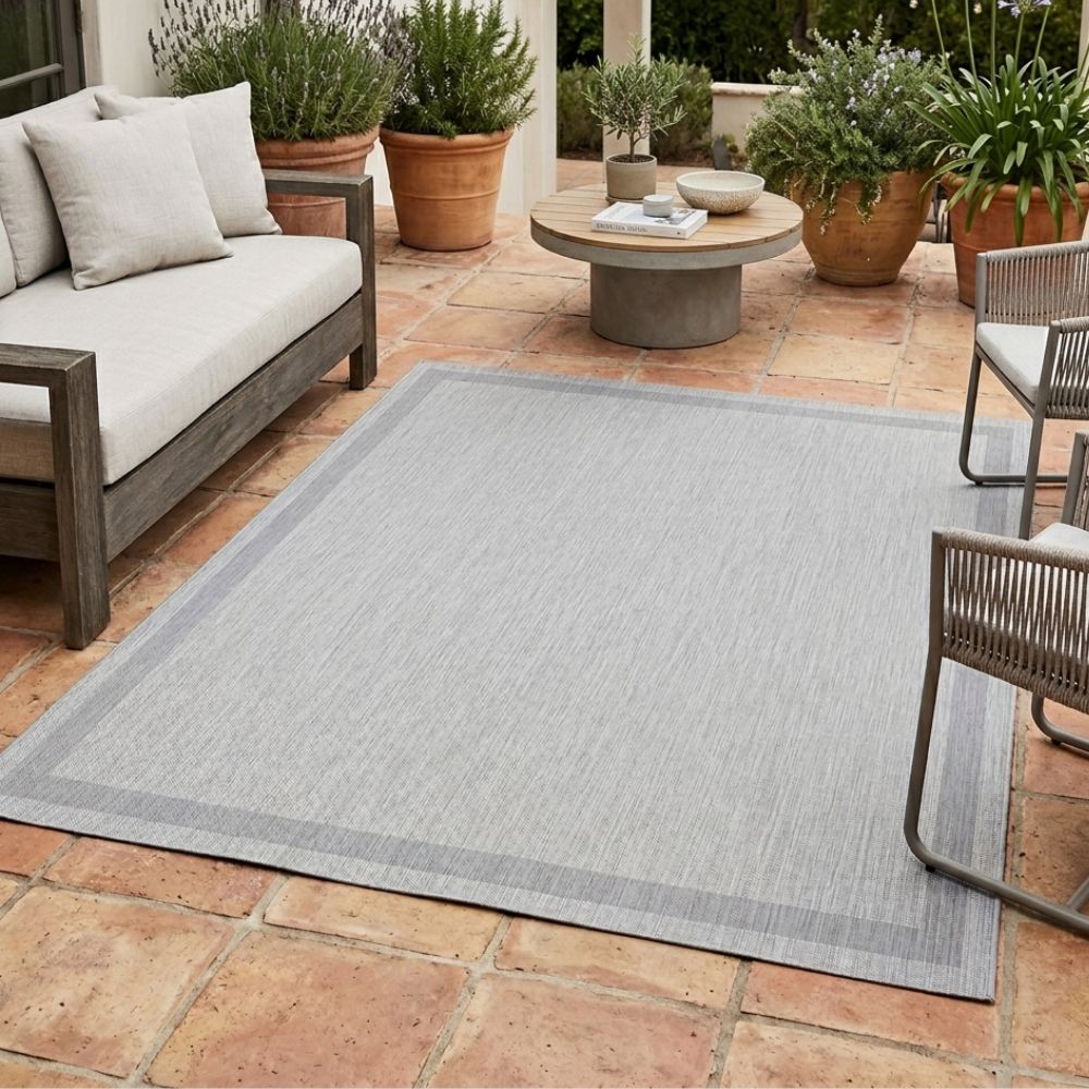 Alfombra de exterior Ankara de 1.40x1.70m en un versátil color gris, ideal para un look contemporáneo y fácil de combinar en cualquier espacio al aire libre.